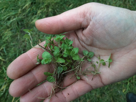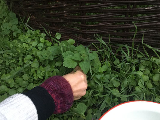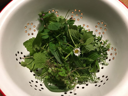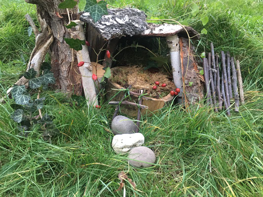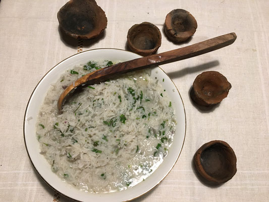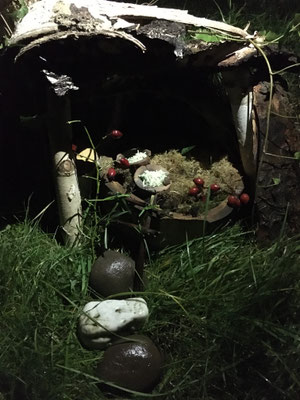 Den Reisbrei mit 7 frischen Kräutern (Girsch, Scharfgarbe, Spitzwegerich, Persischer Ehrenpreis, Portulak, Taubnessel und Labkraut) aus dem Garten teilten wir mit den Gartenwesen in der Zwergenhütte unterm Hollerbusch.