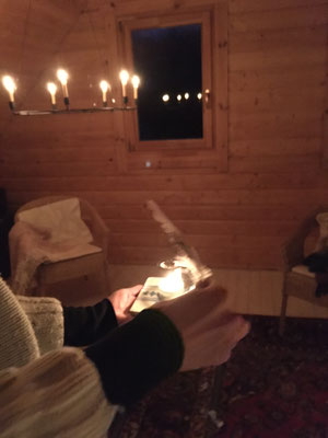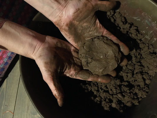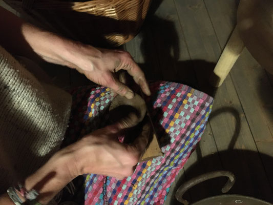 Wir räucherten die Räume, um die Herzen zu öffnen und den Geist wach zu halten. Wir töpferten Räucherschalen aus der Hutzelgarten-Erde und brannten sie im Ofen aus. Negative Erinnerungen schrieben wir auf Zettel und verbrannten sie. Das gehauchte Räucherorakel gab uns Inspiration.